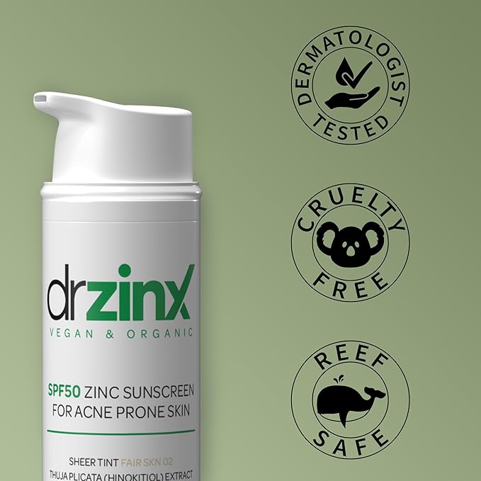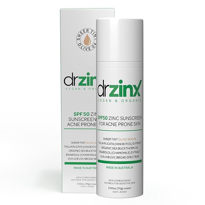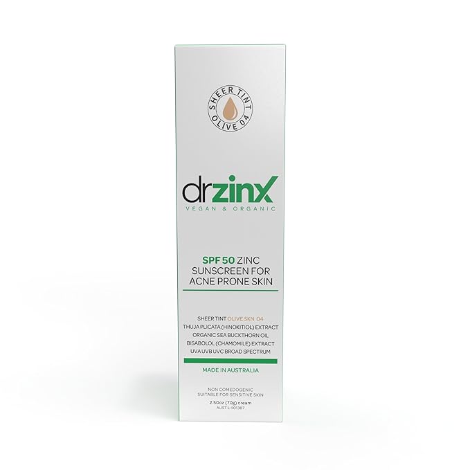 Dr ZinX Organic Mineral Sunscreen for Acne Prone Skin SPF50, OLIVE Tint, Zinc + Hinokitiol (Cedar Oil)