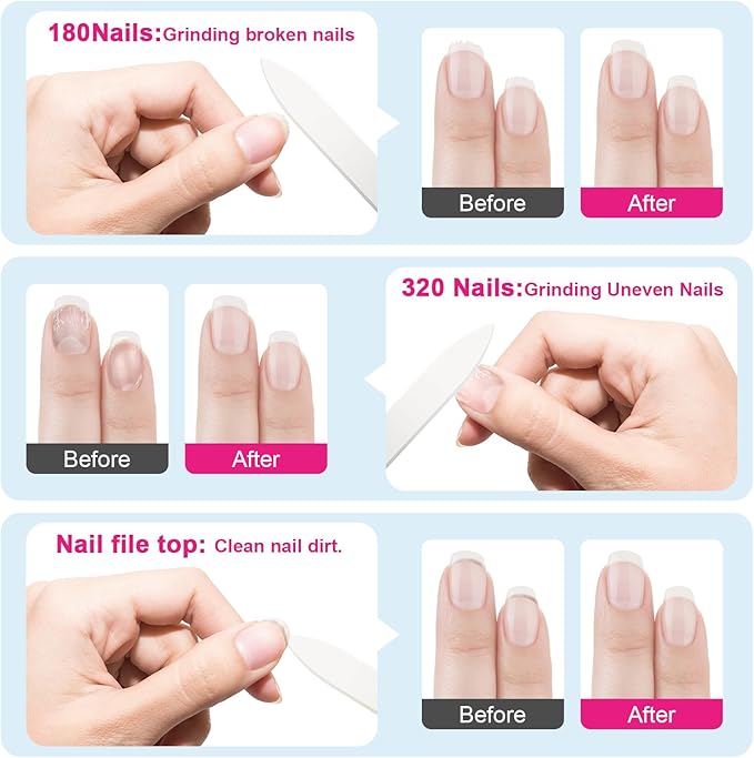 - 180/320 Dual-grit Glass Nail File:customized for natural nails.The 180-grit side efficiently smooths broken or chipped nails, while the 320-grit side perfects their shape. The pointed tip effectively removes dirt and debris. This innovative file promotes healthy nail growth, keeping your nails long, beautiful, and strong!
