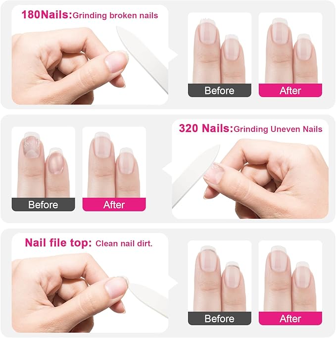 - 180/320 Dual-grit Glass Nail File:customized for natural nails.The 180-grit side efficiently smooths broken or chipped nails, while the 320-grit side perfects their shape. The pointed tip effectively removes dirt and debris. This innovative file promotes healthy nail growth, keeping your nails long, beautiful, and strong!
