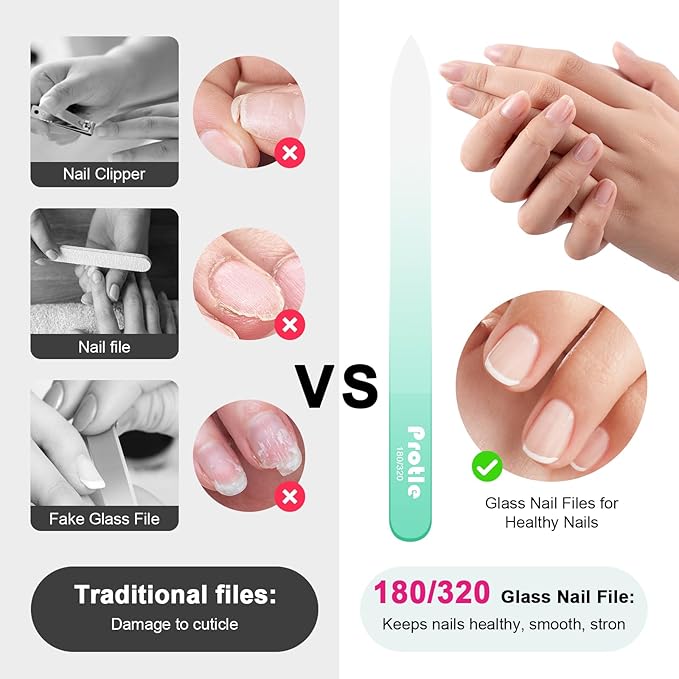 - 180/320 Dual-grit Glass Nail File:customized for natural nails.The 180-grit side efficiently smooths broken or chipped nails, while the 320-grit side perfects their shape. The pointed tip effectively removes dirt and debris. This innovative file promotes healthy nail growth, keeping your nails long, beautiful, and strong!