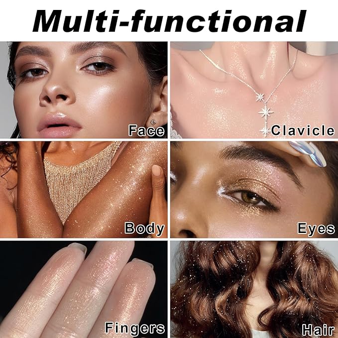 - ✿【Multi-usages】The Glitter Brush Powder not only can be used for face make like glitter eyeshadow and cheeks blush, but also can as body glitter spray for neck, collarbone, legs, hair, or clothing. The 4 colors is Pearl White, Champagne, Nude Pink, Metallic Silver.