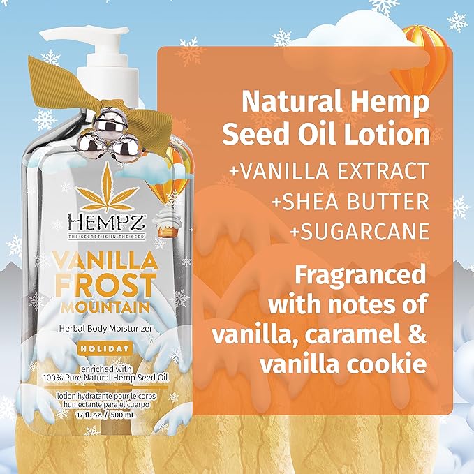 - Hempz limited edition vanilla frosted mountain herbal body lotion moisturizer (17 oz) – this daily moisturizer uses 100% hemp seed oil, is rich in omega fatty acids & is perfect for women & men with dry or sensitive skin