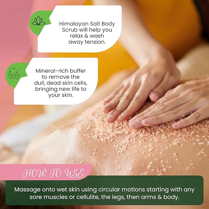 - Suitable for all skin types: The natural and gentle ingredients in the Himalayan Salt body scrub make it suitable for all skin types, including sensitive skin. It's free from synthetic fragrances making it a great choice for anyone who wants to incorporate natural products into their skincare routine.