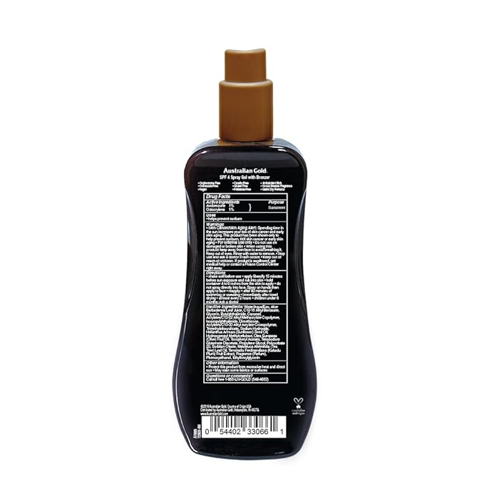 - SPF 4 SUNSCREEN SPRAY GEL with Sunflower Seed Oil, Olive Fruit Oil & Cocoa Seed Butter is designed to provide ultimate hydration that deeply moisturizes the skin, and the Caramel Bronzer imparts a faux sun-kissed golden glow for an instant tinted look