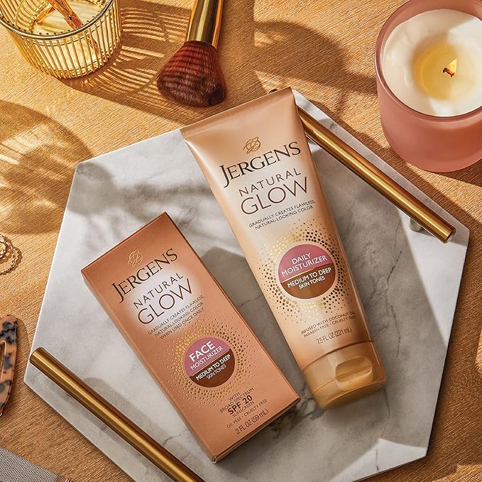 Jergens Natural Glow Self Tanner Face Moisturizer, SPF 20 Facial Sunscreen, Medium to Deep Skin Tone, Sunless Tanning, Oil Free, Broad Spectrum Protection UVA and UVB, 2 oz (Packaging May Vary)