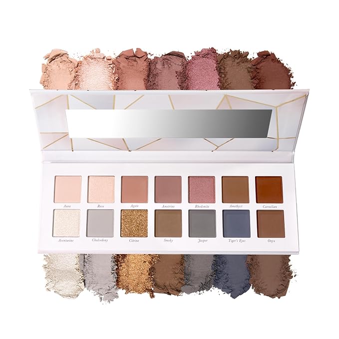 - CREAMY & CREASE-PROOF: This selection of 14 pressed eyeshadows includes both lustrous shimmer and classic matte shades, all inspired the soft hues of natural crystals.