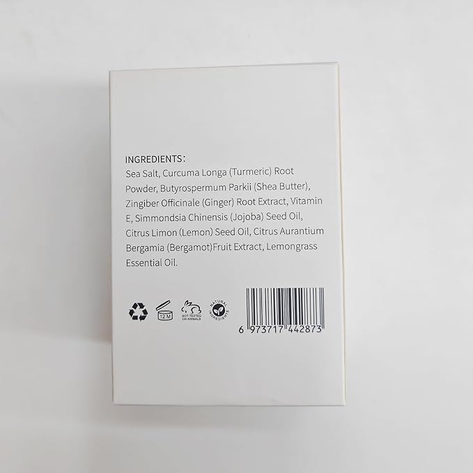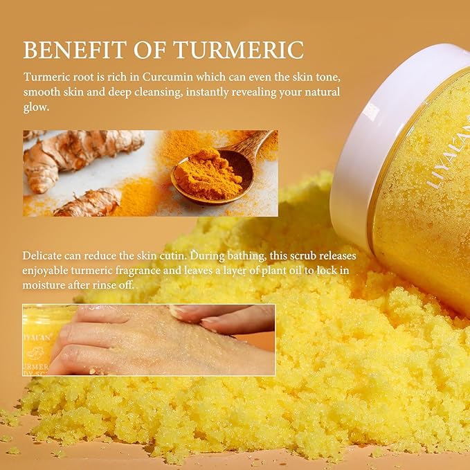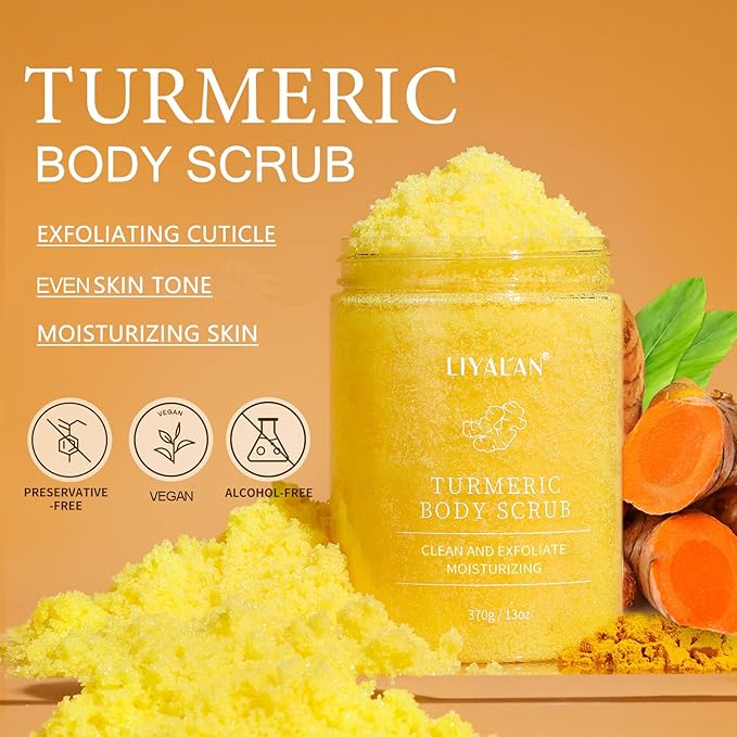 - Turmeric body scrub has been formulated with turmeric, shea butter, bergamot extract, and lemon grass essential oil, as well as oils that have a zero comedogenic, meaning that it won't clog pores and nourish skin well.