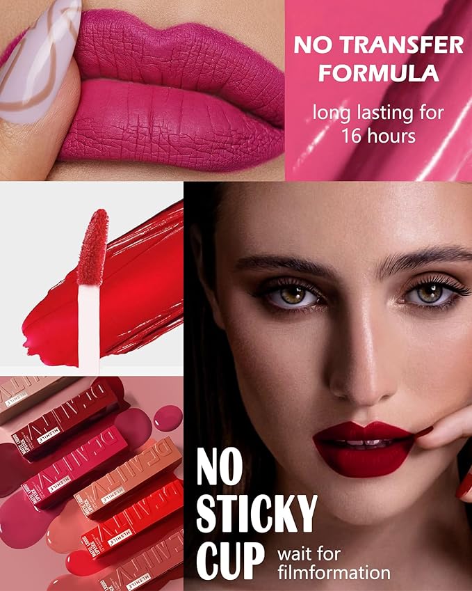 - VELVET MATTE LIQUID LIPSTICK - The long wear highly-pigmented liquid matte lipsticks deliver smudge-proof waterproof, featuring our color lock formula. Soft velvet texture glides on effortlessly and covers evenly, and dries down to a luxurious and matte finish that defies smudging and transfer, which up to 16 hours wear. Available in six daily pop-colors to meet your daily use needs and create a perfect lip look.