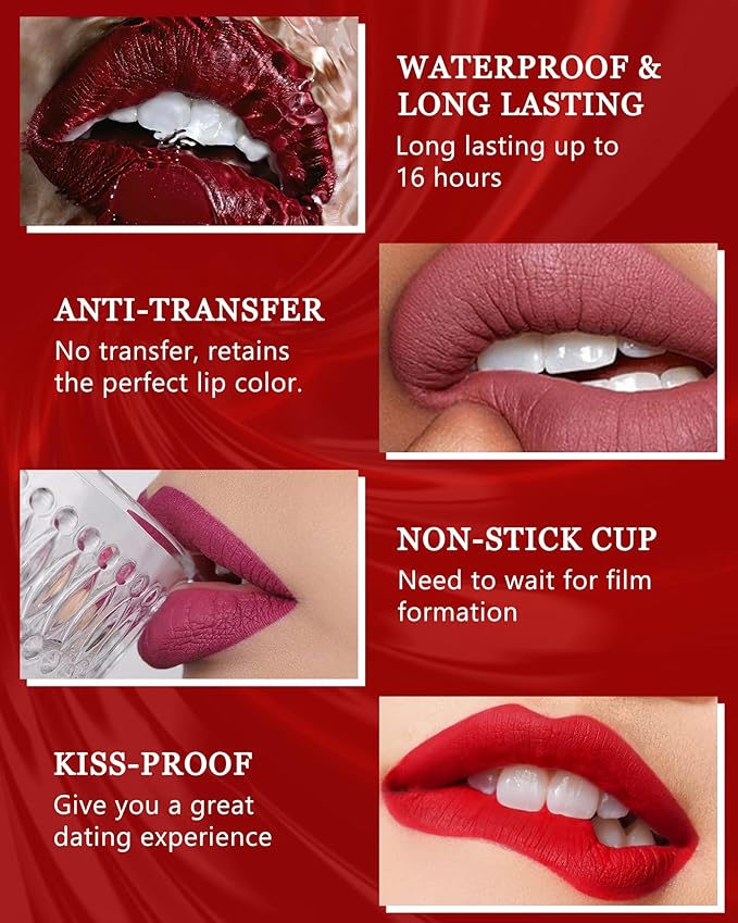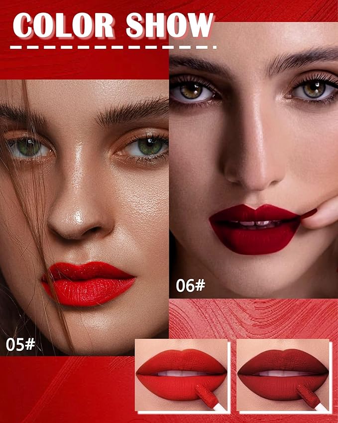 - VELVET MATTE LIQUID LIPSTICK - The long wear highly-pigmented liquid matte lipsticks deliver smudge-proof waterproof, featuring our color lock formula. Soft velvet texture glides on effortlessly and covers evenly, and dries down to a luxurious and matte finish that defies smudging and transfer, which up to 16 hours wear. Available in six daily pop-colors to meet your daily use needs and create a perfect lip look.