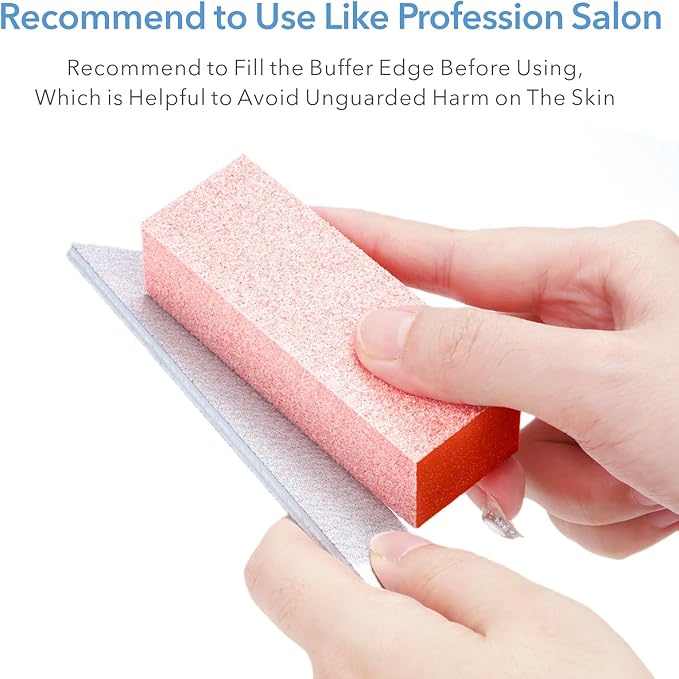 - SALON GRADE QUALITY STANDARD: Made of high-elastic sponge, which is bendable, soft and light weight. Also, this high density sponge material make the buffer block runs smoothly for a perfect nail treatment without causing any chip or crack. Coated with top grade white corundum sand on the surface, to provide smooth, efficient buffing effect. Enhanced coating offered more durable quality. Coated adhesive glue for sanding surface, which makes the sand stick strongly and not easy to drop off