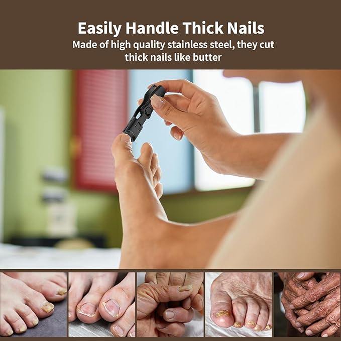 - Ultra Sharp Blades for Precise Trimming: Crafted from high-density stainless steel using advanced technology, these toe nail clippers for thick nails for seniors offer exceptional durability and sharpness. The precision-engineered curved blades and strong wide jaw provide smooth, accurate cuts, making them ideal for thick nails in adults, seniors, men, and pets.