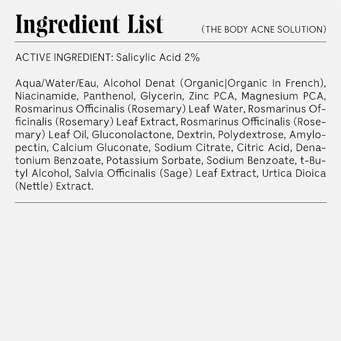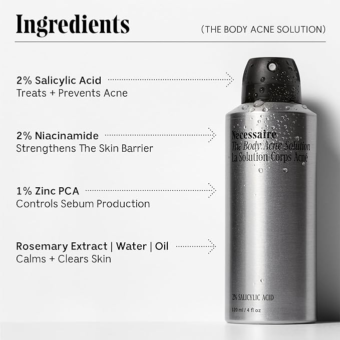 - SKINCARE FOR THE BODY: The Body Solution is a medicated, quick-dry 2% Salicylic Acid clearing spray with Niacinamide, Zinc PCA and Rosemary to treat and prevent body breakouts.