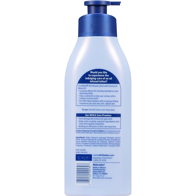 - Includes one (1) 16.9 fluid ounce bottle of NIVEA Oil Infused Coconut and Monoi Oil Body Lotion