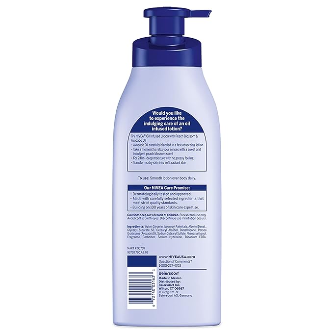 - Includes one (1) 16.9 fluid ounce bottle of NIVEA Oil Infused Peach Blossom and Avocado Oil Body Lotion, Scented Body Lotion