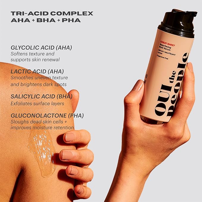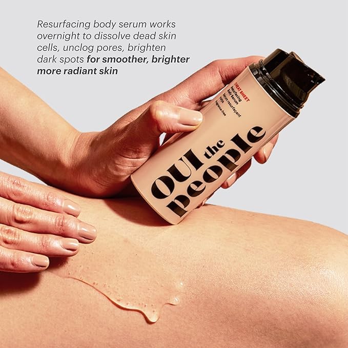 - Resurfacing Body Serum: This overnight body serum is designed to resurface your skin and target a range of skin concerns. It contains a blend of AHAs (alpha hydroxy acids), BHAs (beta hydroxy acids), and PHAs (polyhydroxy acids), which work together to exfoliate dead skin cells, unclog pores, and promote cell turnover