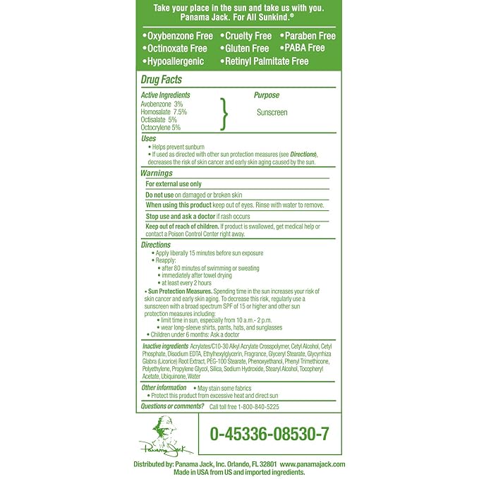 - Panama Jack Faces sunscreen lotion is oxybenzone and octinoxate free and provides broad spectrum UVA/UVB protection in a non-greasy, hypoallergenic gentle touch formula