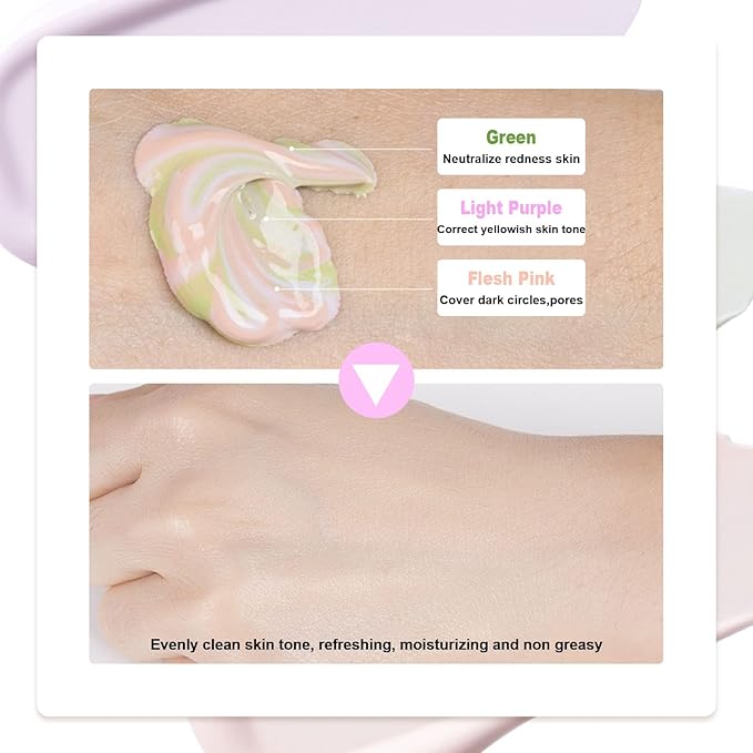 - 3 in 1 Makeup Primer: Containing 3 shades, this primer face makeup brightens dullness and evens out skin tone. Light purple can correct yellowish skin tone, green can neutralize reddish skin, flesh pink can cover dark circles and pores, etc