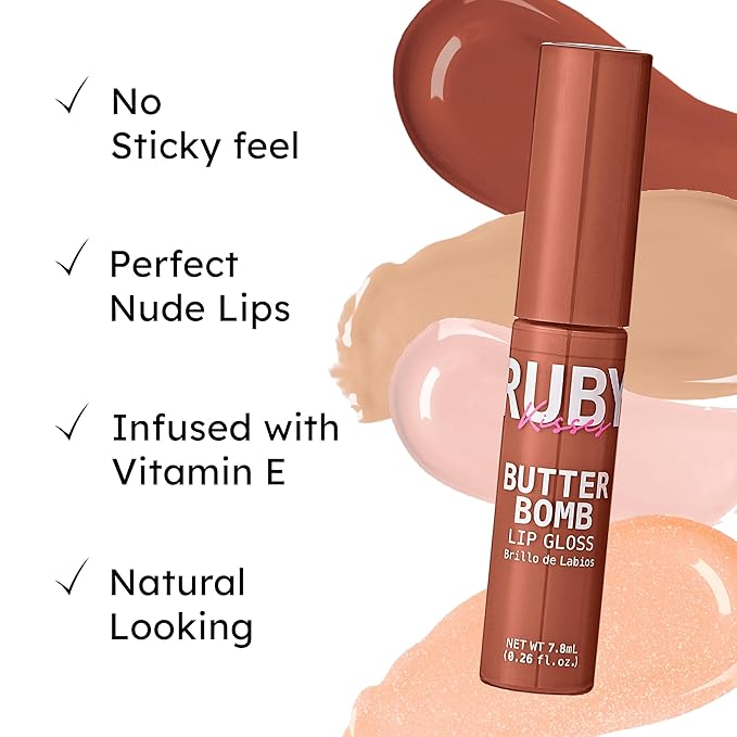 Ruby Kisses Lip Gloss Butter Bomb Gloss Non-Sticky Lip Gloss Vitamin E Natural Nude Lip Makeup - 7.8mL (0.26 US fl.oz) (Snatched)