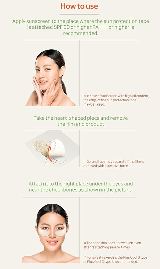 - 🌈 HOW TO USE : Apply sunscreen to the place where the sun protection tape is attached SPF 30 of higher PA+++ of higher is recommended. Take the heart-shaped piece and remove the film and product. Attach it to the right place under the eyes and near the cheekbones as shown in the picture. (3.35inch * 1.38inch / 8.5cm * 3.5cm)