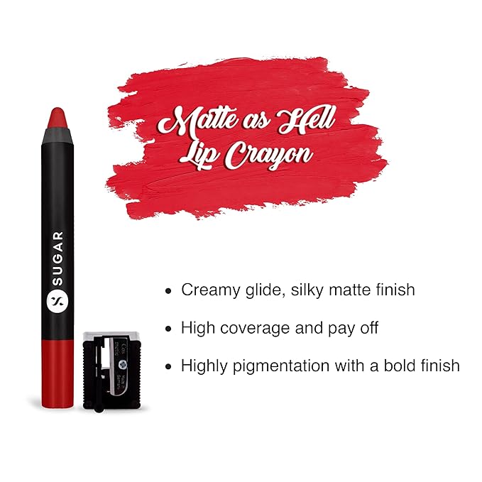 SUGAR Matte as Hell Crayon Lipsticks for Women | Lasts Upto 12hrs | Lip Crayon with Sharpener | 2.8gm - 01 Scarlett O'Hara
