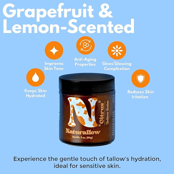 - Radiant Revival - Brighten your skin with our "Citrus" Grass Fed & finished Tallow Balm. Infused with grapefruit and lemon oil, it's body care essential. Enjoy a rejuvenated glow and the benefits of grass-fed organic tallow.