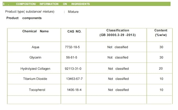 - Active Ingredients: Glycerin 30%, Hydrolyzed Collagen 20%, Titanium Dioxide 10%, Tocopherol 10%, Aqua 30%. Ingredients:Water, butylene glycol, glycerin,6017, TGl, titanium dioxide, silicapowder, Squalane, caprylic/caprylic acid triglycerides,Grapeseed oil, isononyl isononate,hydrogenated lecithin, purslaneextract, Nicotinamide, betaine,sodium hyaluronate, 1,2-hexanediolMagnesium Stearate, TurmericExtract