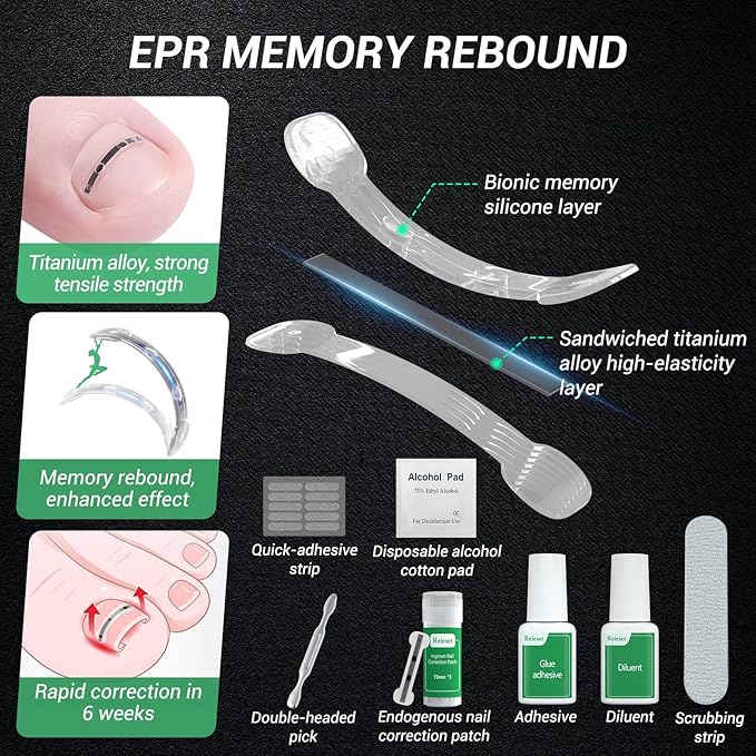 - 【Titanium alloy patented technology】 The patch is made using patented technology and titanium alloy, which has strong tensile strength and high toughness, and will not break even when bent 180°. In addition, the outer layer of bionic memory silicone allows the memory to rebound and quickly alleviate the inward growth of toenails