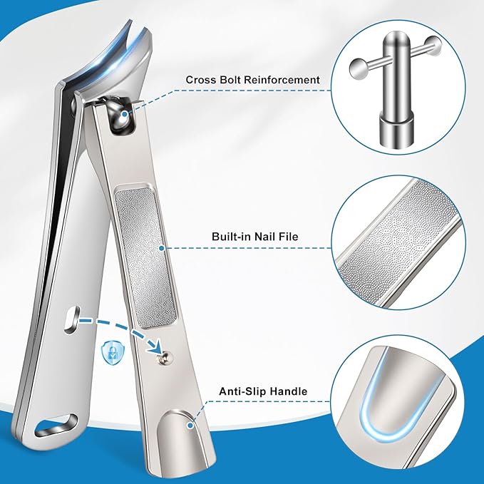 - Wide Jaw Opening Toenail Clippers For Thick Nails: Large toenail clippers for men is wider than the opening of ordinary nail clippers for seniors, and can be opened up to 12mm,which can easily clip any thick or ingrown toenails.The nail clippers for seniors thick nails adopt an innovative lever design that reduces the pressure required to cut your nails