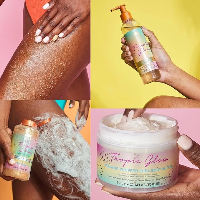 • CONVENIENT SET: This practical set includes Tropic Glow Shea Sugar Scrub, Sparkling Gel Wash, Whipped Shea Body Butter, AND Moisturizing Shave Oil, bundled with a Beauty Patooty self-care kit - a makeup bag, a lip balm, and a satin eye mask.
