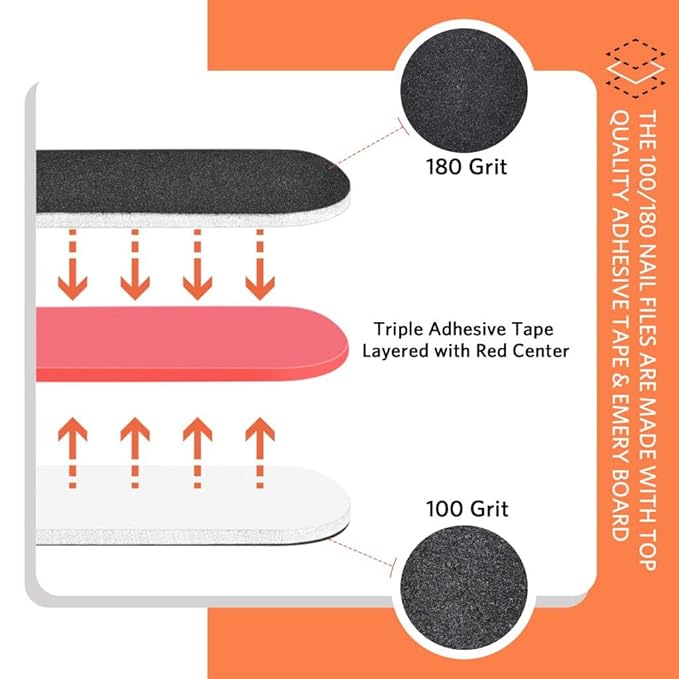 - Double Sided Emery Boards: Nail files are made with quality EVC+ Emery board materials. File and rough up the hard fingernails and toe nails in 100 grit, 180 grit smooths up your nail edge with refined shape.